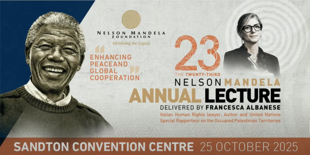 This comes after Albanese, the Italian international law expert specialising in human rights and the Middle East, delivered the 23rd Nelson Mandela Annual Lecture, in which she said: “I think that South Africa’s legacy shows us that no system of oppression can endure forever, and against all odds, the people united can truly challenge and change the course of history.”