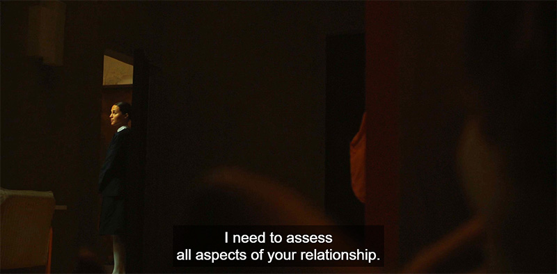 The assessor, named Virginia, is often framed between the couple, symbolically representing the State putting itself between individuals.
