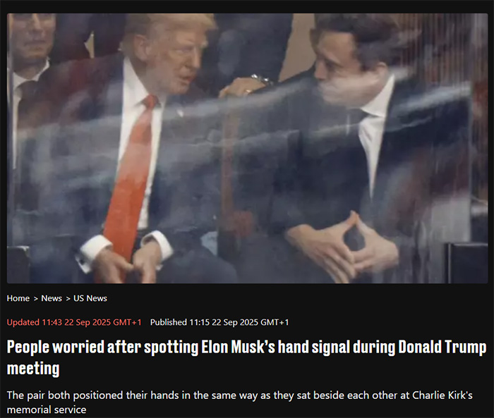 This picture of Trump and Musk discussing at Charlie Kirk’s memorial went viral due to their hand positioning, which some call the “pyramid sign.”