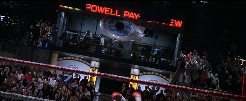 We later learn that this guy is in on the hit. His screaming “Here comes the pain” signals the boxer to dive, which causes a distraction, after which a sniper shoots Charles Kirkland.