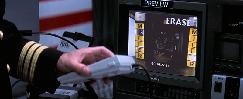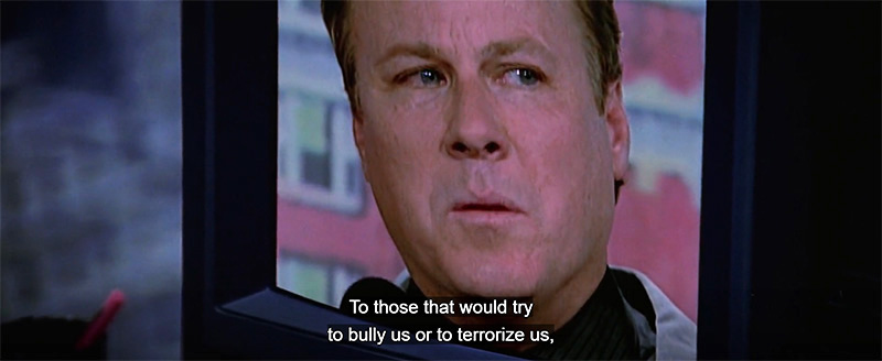 Dunnes gives the “terrorist” instructions before the hit. Notice his blue ring. It bizarrely glows right before the hit. What do these rings signify? We’ll get a hint at the very end of the movie.