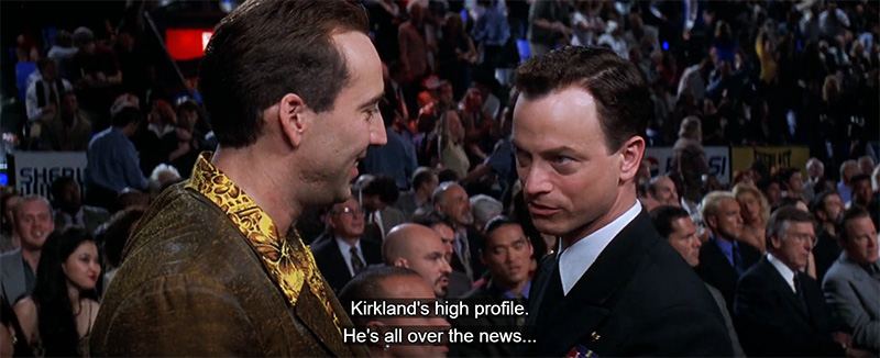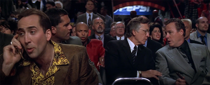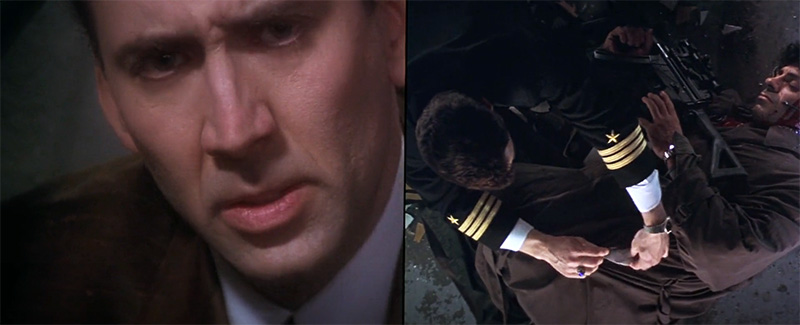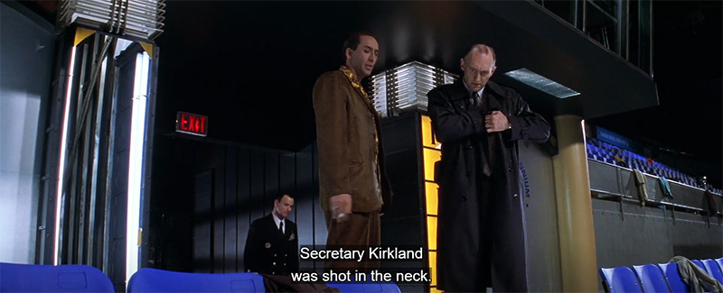 Inside the stadium, a flamboyant Atlantic City detective named Rick Santoro (played by Nicolas Cage) attends the fight. He meets with his childhood friend Kevin Dunne, a U.S. Navy Commander working with the Department of Defense. However, Dunne is not there as a boxing fan; he’s in charge of protecting Defense Secretary Charles Kirkland.