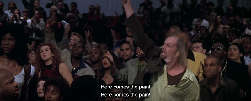Then, a strange, long-haired man starts yelling “Here comes the pain” repeatedly.