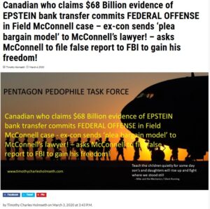 CANADIAN CHILD TRAFFICKER AND EPSTEIN MONEY MAN COMMUNICATED WITH THE STATE OF MINNESOTA’S STAR WITNESS AGAINST TIMOTHY HOLMSETH, FIELD MCCONNELL’S ATTORNEY HOWARD SOHN, AND PROSECUTORS IN FLORIDA – PENNED A PLEA DEAL PROPOSAL THAT REQUIRED MCCONNELL MAKE A STATEMENT TO THE FBI AGAINST HOLMSETH SO THE FBI COULD ARREST HOLMSETH