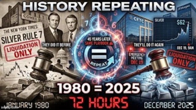 This is the 1980 Hunt Brothers playbook repeating word-for-word. In 1980, when the Hunts cornered the silver market and banks faced insolvency, the CFTC instituted “liquidation-only trading” – you could only SELL, not BUY. Silver crashed from $50 to $10 in six weeks.