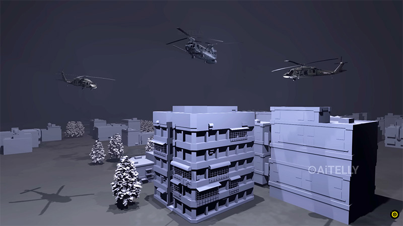 This is a 3d reenactment of the actual “extraction mission” in Caracas from the YouTube channel AiTelly. Helicopters over a tall building in Caracas.