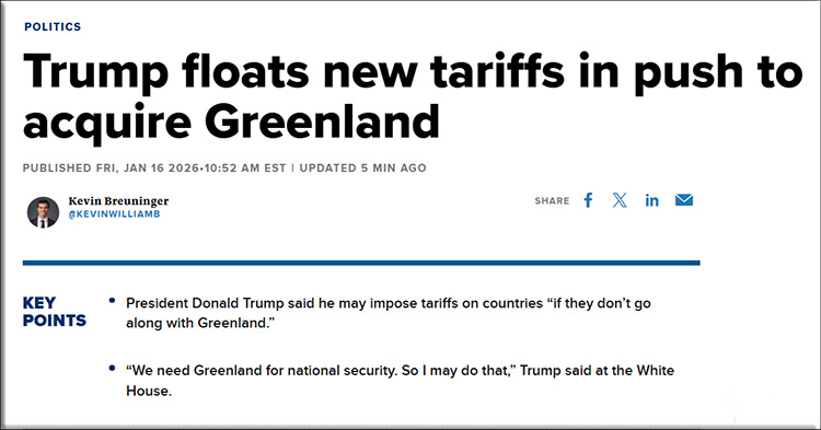 A 2026 headline about the United States needing to take control of Greenland for national security.