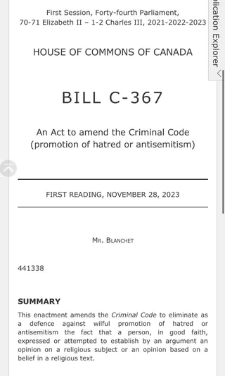 Bill C 367 – Canada – An Act to Halt Hate Speech and Anti-Semitism – so you can’t quote scripture to a Jew 1 of the population