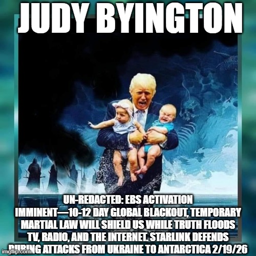 Judy Byington: Un-Redacted: EBS Activation Imminent—10-12 Day Global Blackout, Temporary Martial Law Will Shield Us While Truth Floods TV, Radio, Internet. Starlink Defends During Attacks From Ukraine To Antarctica 2/19/26