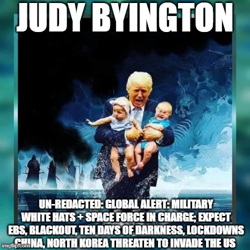 Judy Byington: Un-Redacted: Global Alert: Military White Hats + Space Force In Charge Expect EBS, Blackout, Ten Days of Darkness, Lockdowns China, N. Korea Threaten To Invade the US (Video)...