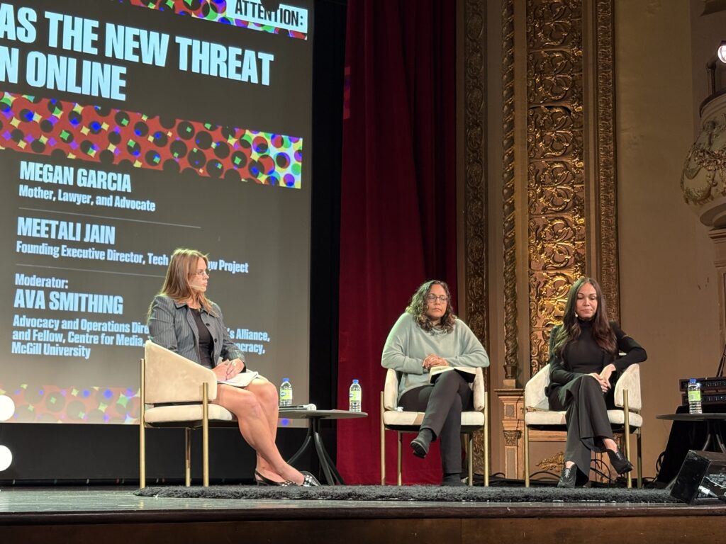 Ava Smithing introduces herself as born in 2001 and tells us she’s never had a restful night due to her awareness of the ways in which technology exploits our attention, data and selfhood. Meetali Jain, the founding executive director of the Tech Justice Law Project is asked about digital companions, a term she explicitly rejects. She prefers to call them chatbots or chatterboxes, probabilistic algorithms that guess at what to say next. She references Mark Zuckerberg’s statement that human companionship needs could be met with these systems, and Smithing notes that Zuckerberg is anxious to solve a problem he’s caused.