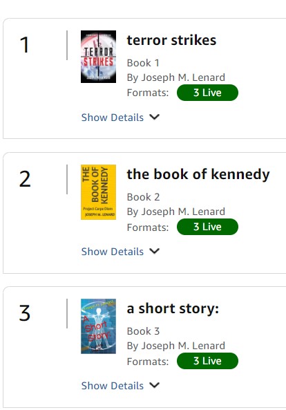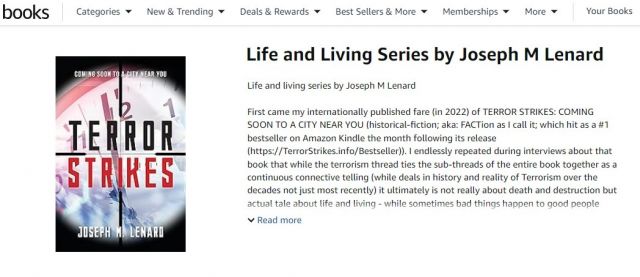 [well, NOT the update I was expecting to make (Thu. Oct. 23 2025 21:13) but here it is - the LIFE AND LIVING SERIES is temporarily OFFLINE due to Amazon screw-up. Been in touch with them and of course (see my B4IN pieces on LACK OF CUSTOMER SERVICE these days (/business/2025/10/the-sorry-state-of-customer-service-and-caring-everywhere-part-2-3769401.html)) the person spoken with is just there to answer the phones and CANNOT DO A DAMN THING to fix that it is HUNG (in Pending status) again following a minor update I made and the Amazon AI Automated system has made the same ERROR again needing a Human to step in and FIX/bypass to get it active/LIVE again and of course can NEVER, EVER, get to a human that can actually fix a problem and tell you MAY TAKE UP TO 24-48 HOURS and they'll get back to you by email. Meanwhile, all 3 books relate to the series are online and available. Or, direct from me: https://JosephMLenard.us/shop.