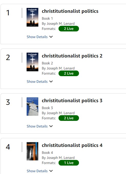 [Before I get into the series descriptions, let me first apologize for things OUT OF MY HANDS/CONTROL. Things are NOT ALL FULLY FUNCTIONING properly on the Amazon system (as of now (Fri. Oct. 24 11:26ET)) and get the usual "can take up to 3 days for changes to take effect" excuse. So everything is SUPPOSED to all be fully functioning by Sun. Oct. 26th evening. In meantime, the individual books spoken about here-in (10 total) are all up/online and available for purchase https://tinyurl.com/JLDonAMAZON or most (softcopy versions) available direct from me (Autographed, free shipping, to/for those in USA) via: https://JosephMLenard.us/shop. The main there here in this B4IN piece is about the "inter-connectivity" (note: each designed to be able to be read as stand-alone, or part of the extended collection to which tied (in some cases (like Life and Living series, "loosely" connected vs ChristiTutionalist set more directly inter-relate))) of the books within the defined series.]