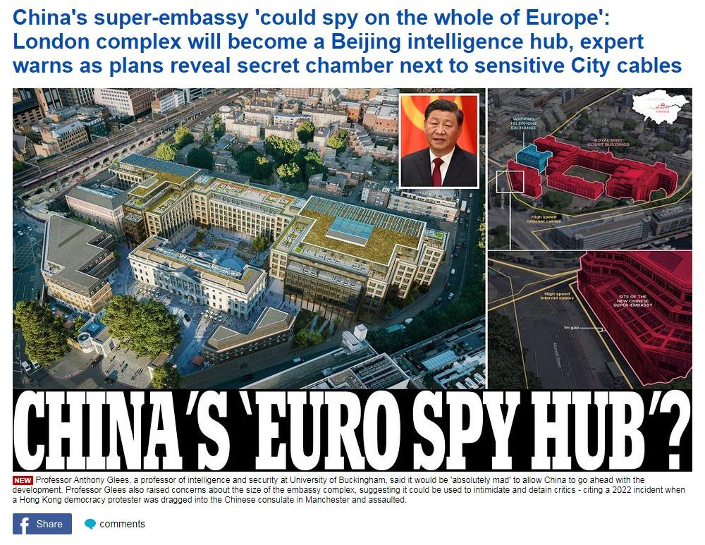 “China’s super-embassy ‘could spy on the whole of Europe’: London complex will become a Beijing intelligence hub, expert warns as plans reveal secret chamber next to sensitive City cables”