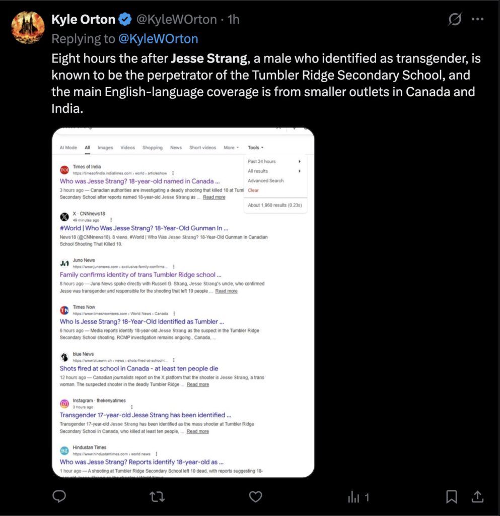 Reports identify Jesse Strang as the alleged transgender suspect in the Canada mass shooting at Tumbler Ridge Secondary School, though authorities have not officially confirmed the shooter’s identity.