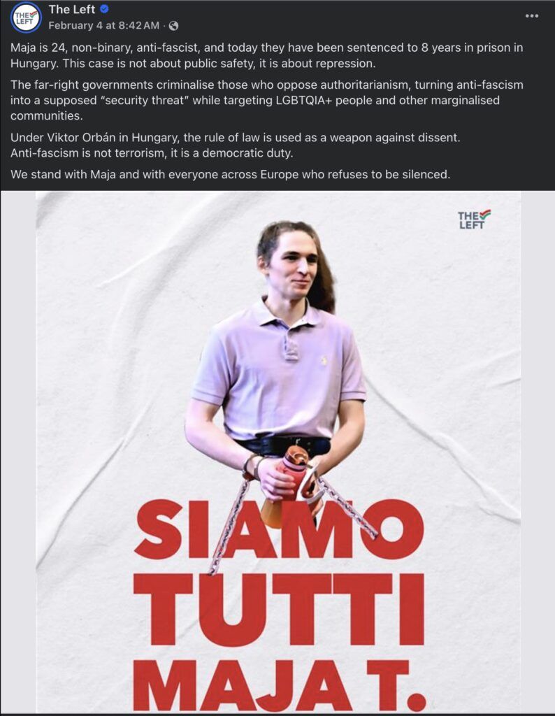 This doesn’t seem to have been in the news much (or maybe I just missed it), but a German transgender Antifa-Ost (Antifa-East) activist was recently (4 Feb 2026) sentenced to 8 years in prison in Hungary. It seems that the media (based on my brief search just now) are falling all over themselves worrying about whether Maja T. could even receive a fair trial in Hungary. (Hungary recognizes only two genders and has banned Pride marches.) As reported in this BBC article of Feb 4, Maja T. was found guilty “of involvement in violent assaults by about 20 members of Antifa Ost in the lead-up to an annual commemoration of Nazi soldiers in Budapest” (Day of Honour) between 9-11 February 2023. Nine people were injured in those assaults, four of them seriously. The attackers used batons, rubber hammers and pepper spray to attack people and were known as the “hammer gang.”