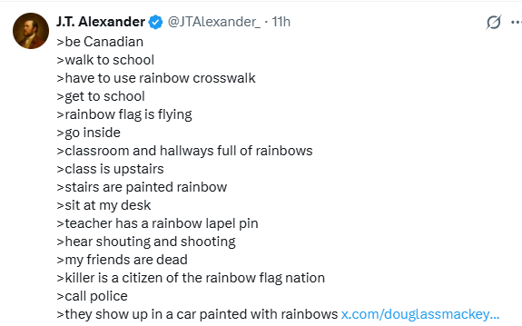1. Interesting and true to varying degrees here and there across Canada. Personally I think it is an effort to try and make people not reproduce. Feminism was likely for similar reasons, at least by some of its proponents. Keep women busy till too old to reproduce. In this case they want to sterilize children before it even occurs to them to do it. In terms of the dialectics, I doubt many parents would drive their kids to Trans-affirming care clinics ion they were called what they really are. Spay and neuter clinics for children.