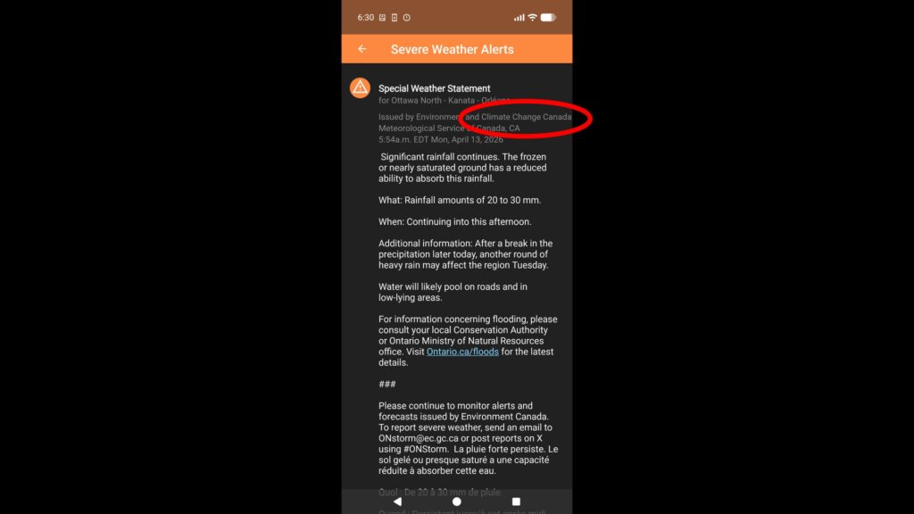 Please note where it lists the name of the Government department on this stupid and unnecessary weather alert in Ottawa: