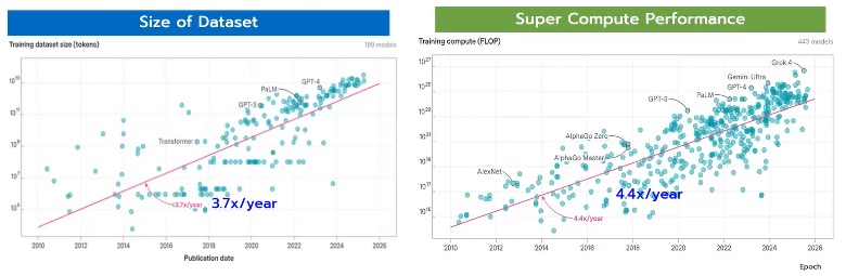 The dataset size to train models is doubling every 6 months with tens of trillions of words in its training vocabulary. The performance of compute to train these models needs to improve by 4.4x every year to support this growth.