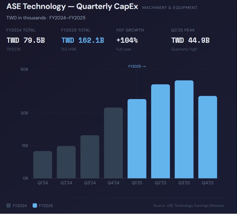 That spike in test equipment CAPEX — ASE spent $1.1 billion in 2025 alone — is a strong signal that the company has won this business. You don’t buy that kind of equipment on speculation.