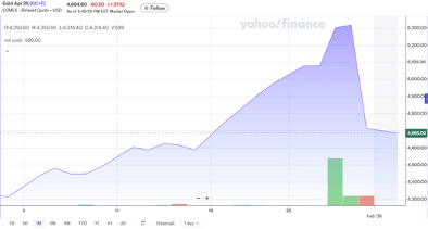 Then again, step back and consider your time horizon. Friday’s closing price for gold and silver still set a monthly record, both for metals and with many share prices. Here’s the chart for January gold, up from $4,300 early in the month to over $4,600 on the last trading day: