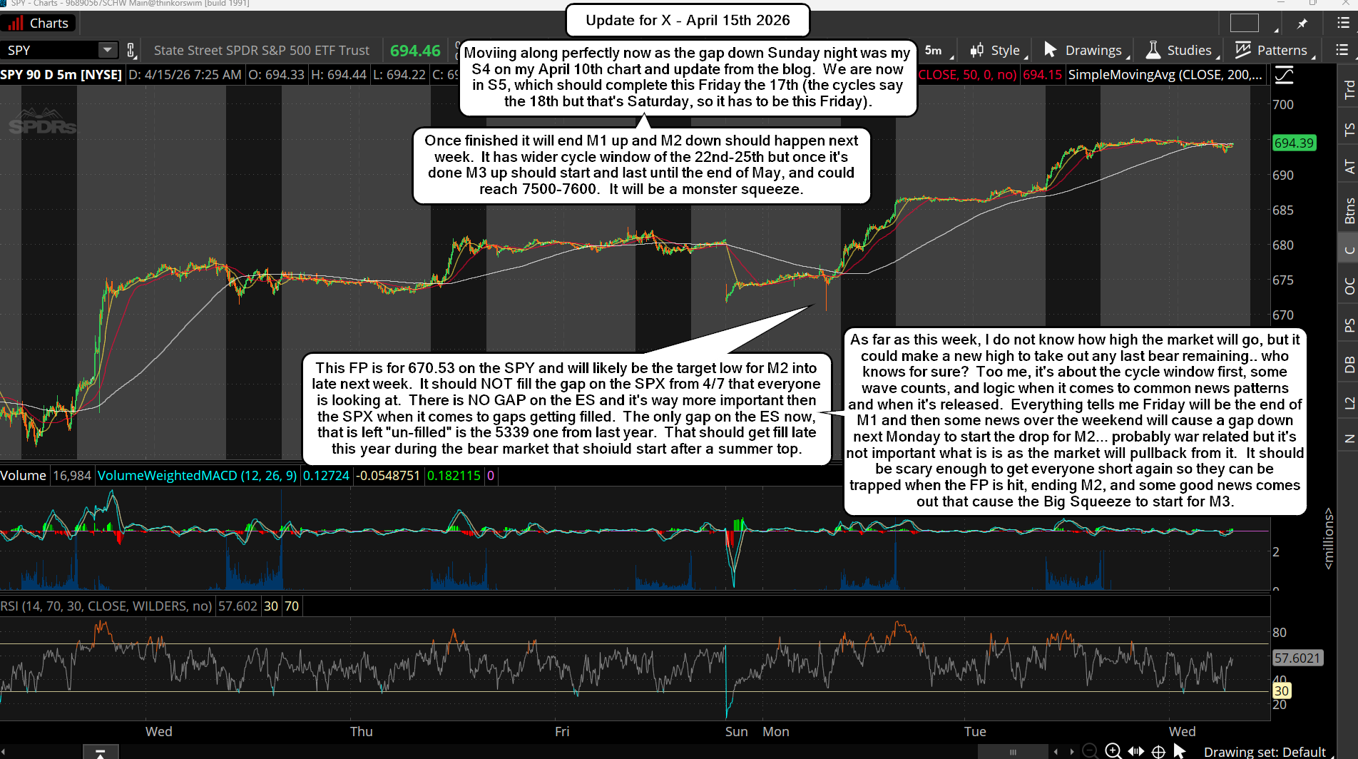 But there’s still another pullback coming next week for Medium Wave 2 down, which will likely be an ABC move with the C wave happening on Thursday or Friday. I say that because the cycle window of time for the low is between the 22nd-25th, which is later in the week. It could end in the beginning of that window I guess, hard to pinpoint the exact day. Cycles don’t always repeat that perfectly, but they get close. Now, how low will it go you ask? That’s a hard question that I con only guess at. I posted on X a few days ago of a chart of a new FP on the SPY of 670.53, which would be close to a 50% pullback from the March low, and right in line with typical wave 2′s (or 4″s).