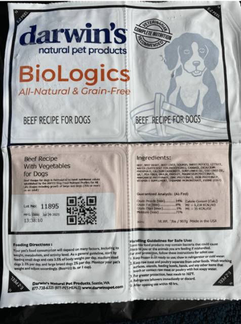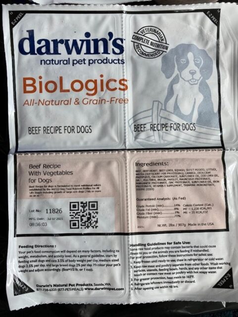 Affected products are sold online through a subscription service in frozen 2-pound packages and consist of certain lots of Darwin’s BioLogics All-Natural & Grain-Free Beef Recipe for Dogs.
