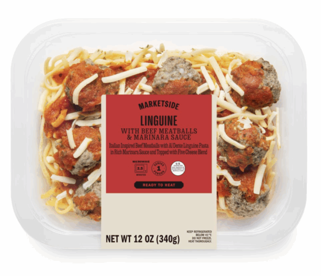 - 12-oz. clear plastic tray packages labeled “MARKETSIDE LINGUINE WITH BEEF MEATBALLS & MARINARA SAUCE” with “best if used by” dates SEP 22, 2025; SEP 24, 2025; SEP 25, 2025; SEP 29, 2025; SEP 30, 2025; and OCT 01, 2025.
