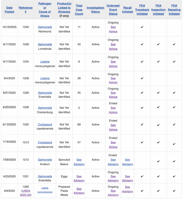 - A new outbreak of Salmonella Richmond (ref #1345) linked to a not yet identified product has been added to the table, FDA has initiated traceback.