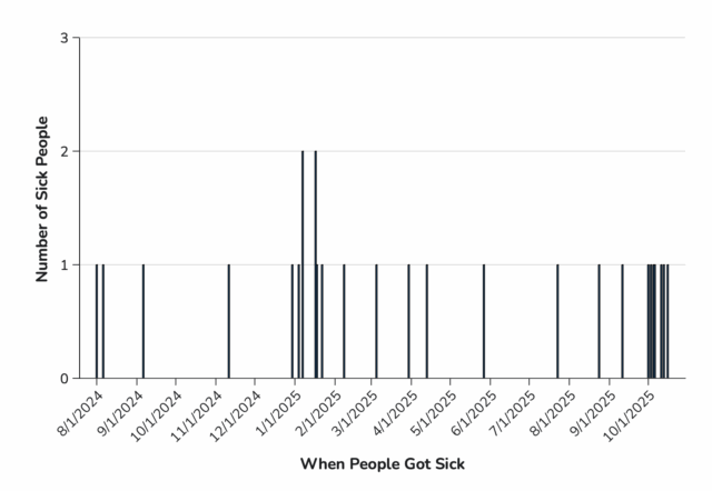 Sick people’s samples were collected on dates ranging from August 1, 2024, to October 16, 2025. Of 26 people with information available, 25 have been hospitalized and 6 deaths have been reported. One death from each of the following states: Hawaii, Illinois, Michigan, Oregon, Texas, and Utah. One pregnancy-associated illness resulted in a fetal loss.