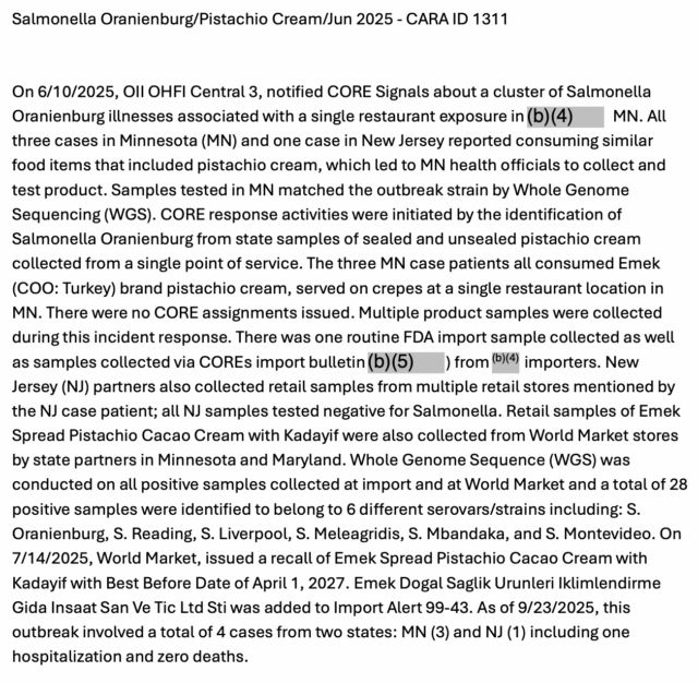 For an outbreak of Salmonella Oanienburg traced to pistachio cream, the FDA has filed an Executive Incident Summary Abstract that includes previously unreleased information. The abstract reports that the outbreak was traced to a restaurant but the name of the restaurant has been redacted from the report. The outbreak sickened four people.