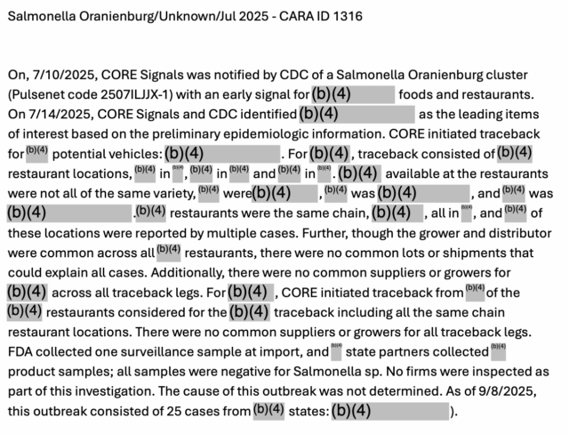 “No firms were inspected as part of this investigation. The cause of this outbreak was not determined. As of 9/8/2025, (b)(4) this outbreak consisted of 25 cases from states (redacted).”