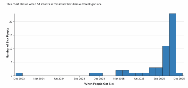 Previously, case counts included illnesses from August 1, 2025, onward. With the expanded definition, CDC and state partners identified 10 additional prior cases that occurred from December 2023 through July 2025. At this time, no cases have been identified between March 2022 and December 2023. All 10 prior cases are confirmed infant botulism cases with documented exposure to ByHeart formula.