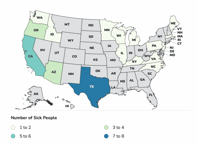 The CDC reported as of December 3, 2025, a total of 39 infants with suspected or confirmed infant botulism and confirmed exposure to ByHeart Whole Nutrition infant formula (various lots) have been reported from 18 states: Arizona 3, California 5, Idaho 1, Illinois 2, Kentucky 1, Massachusetts 2, Maine 1, Michigan 1, Minnesota 2, North Carolina 2, New Jersey 1, Oregon 4, Pennsylvania 1, Rhode Island 1, Texas 8, Virginia 1, Washington 2 and Wisconsin 1.