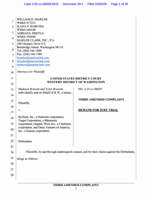 Earlier this week, plaintiffs filed a Third Amended Complaint in Wescott et al. v. ByHeart, Inc., et al., pending in the U.S. District Court for the Western District of Washington. The amendment adds Organic West, Inc. and Dairy Farmers of America, Inc. as defendants. The join ByHeart, Inc. and Target Corporation, which were previously named in the lawsuit.
