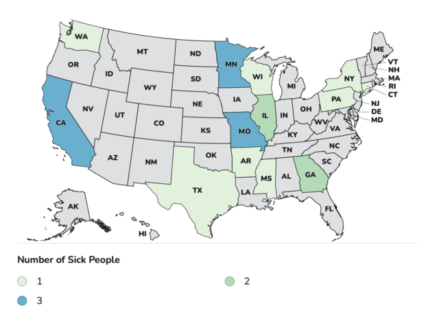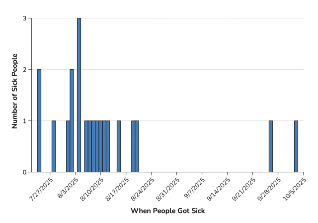 Illnesses started on dates ranging from July 24, 2025, to October 3, 2025. of the 19 people with information available, 8 were hospitalized and no deaths were reported.