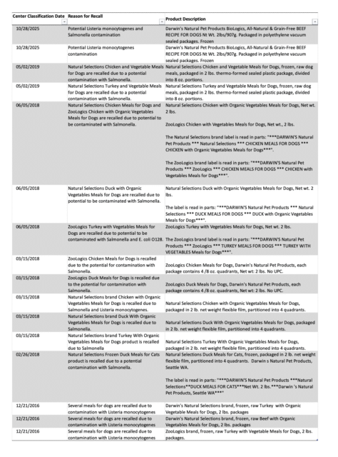 - The FDA is cautioning pet owners that a sample of Darwin’s Natural Pet Products beef dog food made by Arrow Reliance, Inc. tested positive for Escherichia coli (E. coli) O157:H7 that is associated with a human illness. In addition, one sample of Darwin’s chicken dog food and one sample of Darwin’s duck dog food tested positive for Salmonella Infantis and Hadar, respectively. Closed product from the three affected lots, which were obtained from the household freezer of the ill human, was tested by a private third-party laboratory in May and June 2025.