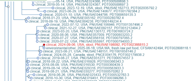 In August 2024, a four-year-old child became infected with E. coli O157:H7 and subsequently developed hemolytic uremic syndrome (HUS), requiring hospitalization and extensive follow-up care. Whole genome sequencing (WGS) provided by the third-party laboratory shows that the E. coli O157:H7 present in the closed product sample of the Darwin’s beef dog food from the household freezer is a genetic match to the E. coli O157:H7 detected in a stool sample from the ill child.[24]