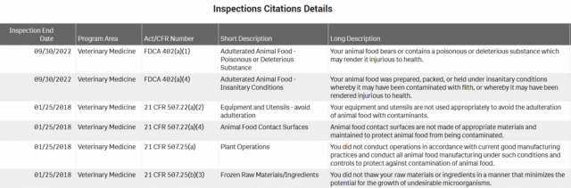 Arrow Reliance has a long history of violating pertinent food laws and regulations. To date, the FDA issued six inspection citations to the Arrow Reliance: two for violating the Federal Food, Drug and Cosmetic Act and four for violating FDA regulations. To illustrate, in 2022, the FDA found that the Arrow Reliance violated the federal legislation because its “animal food bears or contains a poisonous or deleterious substance which may render it injurious to health” and the animal food was “prepared, packed, or held under unsanitary conditions.”[13] The full list of Arrow Reliance’s citations and their descriptions follows: