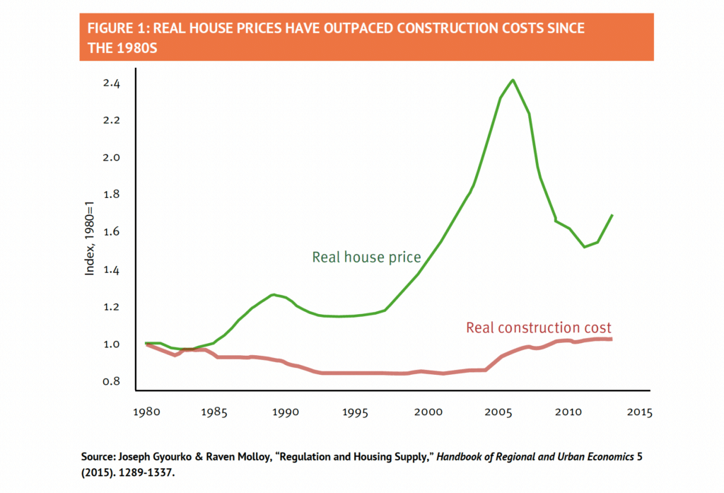Figure 1 shows how, over the last 30 years, housing prices have risen almost twice as fast as real construction costs.