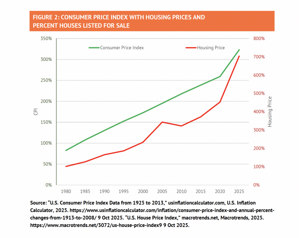 Between 1980 and 2025, consumer prices increased just under 300%, which sounds excessive. But during that same time period, housing prices increased almost 600%, or roughly twice as fast.