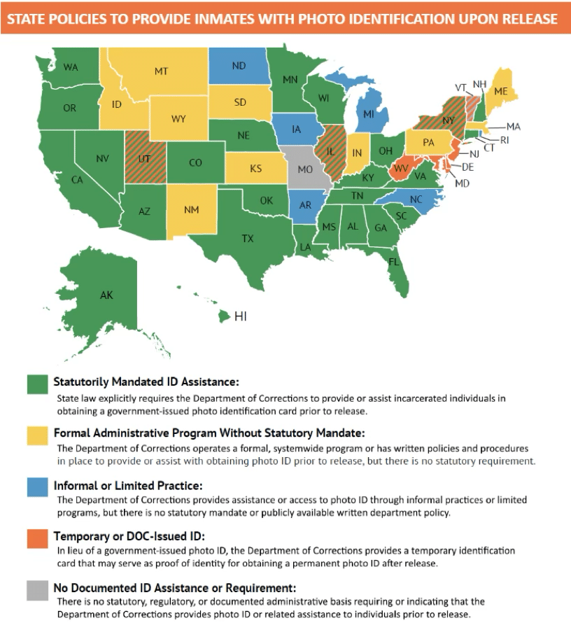 - Twenty-eight states (Alabama, Alaska, Arizona, California, Colorado, Connecticut, Florida, Georgia, Hawaii, Illinois, Kentucky, Louisiana, Minnesota, Mississippi, Nebraska, Nevada, New Hampshire, New York, Ohio, Oklahoma, Oregon, Rhode Island, South Carolina, Tennessee, Texas, Virginia, Washington, and Wisconsin) have enacted laws that explicitly direct the state corrections agency to provide or assist incarcerated individuals in obtaining a photo identification card prior to release.