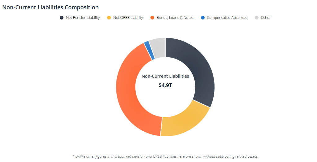 According to Reason Foundation’s GovFinance Dashboard 2025, states, cities, counties, and school districts carry $4.9 trillion in total long-term liabilities, which are obligations due in more than a year. The bonds, loans, and notes category—which includes general oblication debt and special obligation debt—makes up about 41% of all state and local government debt. About 32% consists of unfunded pension obligations ($1.5 trillion) and about 20% ($970 billion) in net other post-employment benefits (OPEB)—mostly unfunded retiree health liabilities.