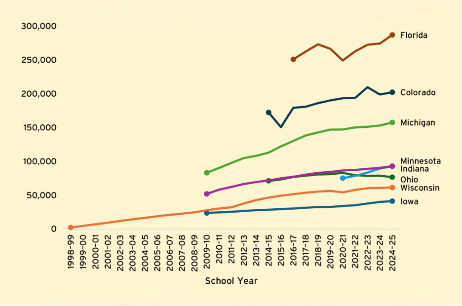 Contrary to concerns that open enrollment could overwhelm public-school districts with unmanageable waves of transfers, open enrollment programs are not prone to abrupt changes in participation. In fact, Figure 1 below illustrates how open enrollment participation increased gradually and predictably over time for the eight largest programs in the country: Colorado, Florida, Indiana, Iowa, Michigan, Minnesota, Ohio, and Wisconsin.
