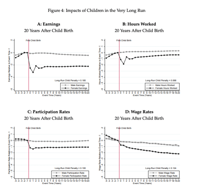 Using Danish administrative data from 1980 to 2013, a study found that men’s and women’s earnings trajectories were nearly parallel before the birth of the first child. The gap opened sharply after childbirth. Although it narrowed somewhat as children aged, it never closed. The authors estimated that the long-run cumulative earnings penalty for mothers was approximately 20%. This pattern is widely reported in analyses that cover American workers.