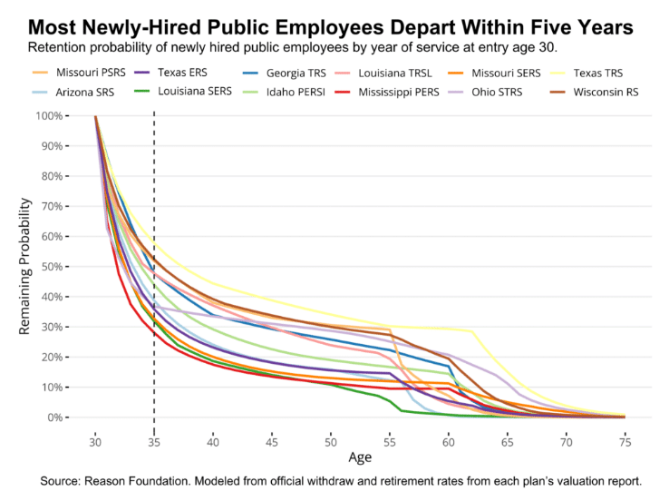 In the public sector, almost all employees are offered traditional DB pensions, which are explicitly designed to encourage continuous tenure with a single employer. This structure provides certainty for employees who plan to remain with an employer for decades, but that has become the exception rather than the rule. A Reason Foundation analysis of 12 public pension plans found that most new hires leave within five years of hire.