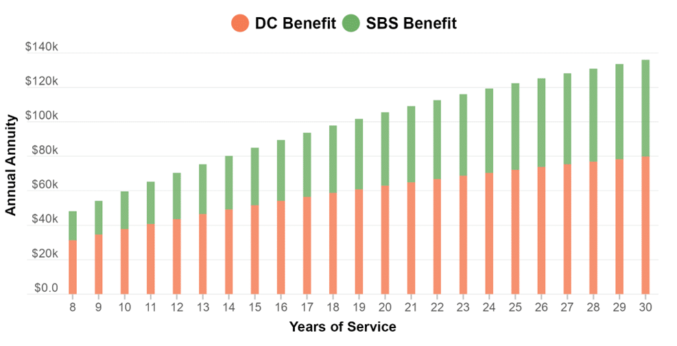 Reason Foundation analysis shows the impact this additional savings would have on teachers’ retirement benefits. A teacher who starts at age 30 already earns an estimated $79,750 in annual benefits after 30 years of service under the existing defined contribution (DC) plan. Giving teachers the SBS-AP would add another estimated $56,280 in annual retirement benefits.