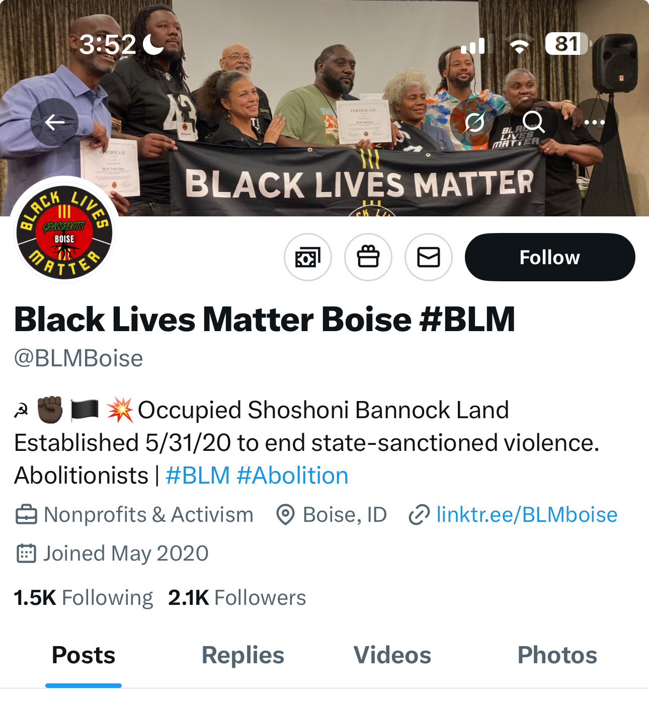 Black Lives Matter Boise hilariously describes itself on social media as operating on “Occupied Shoshoni Bannock Land,” the current leftist virtue signaling trend, and claims to exist to “end state-sanctioned violence.” Their messaging is drenched in the familiar (and tired) revolutionary language of “abolition” and “defunding the police.”