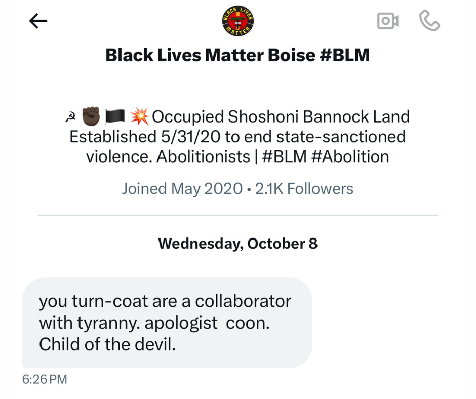 When BLM Boise sent me a direct message calling me a “turn-coat,” “apologist coon,” and “child of the devil,” they were not just spewing personal hatred. They were revealing what they truly stand for, which is racial division, bitterness, and intimidation.