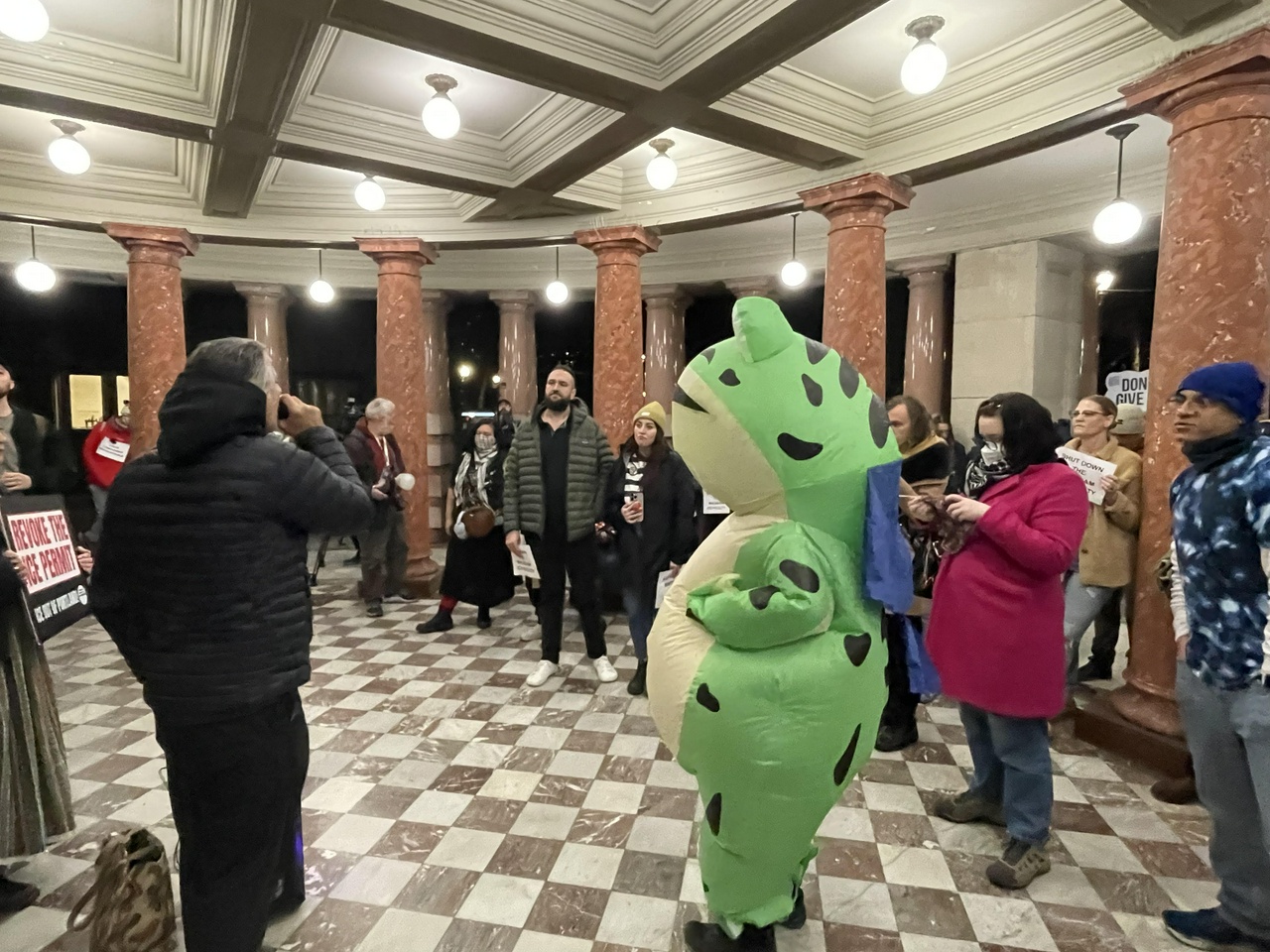 Protesters rallied outside city hall at 5 p.m. with calls to reject the ordinance and called for city council to instead focus on shutting down the ICE facility entirely and then entered the chambers for over an hour of public testimony, overwhelmingly against the ordinance and in favor of revoking the permit.